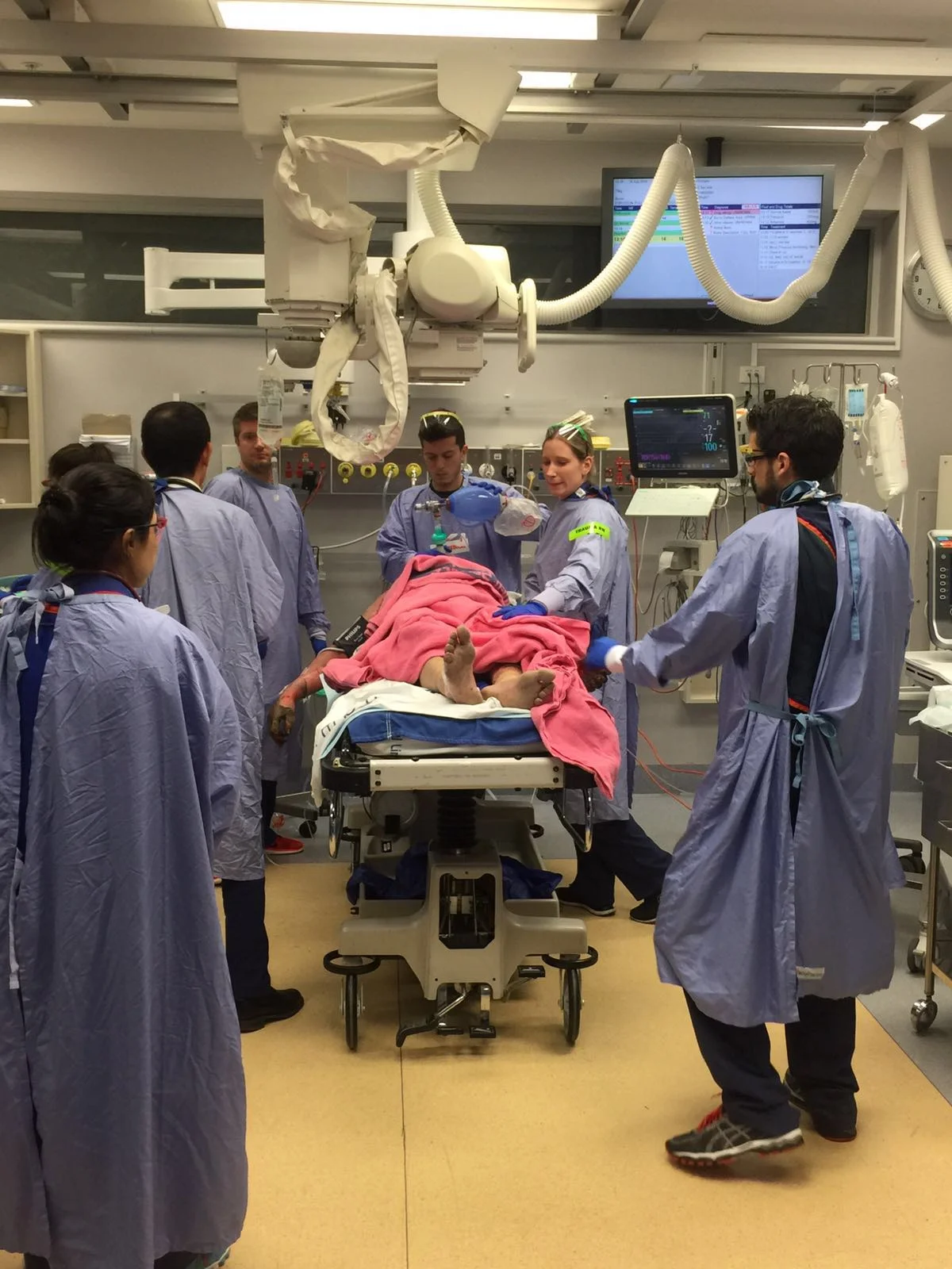The Trauma Team view prompts and patient data on a large overhead monitor mounted on the wall of the Trauma Bay. In this way, compliance with the algorithms is guided by real-time computer generated prompts linked to real-time data collection.